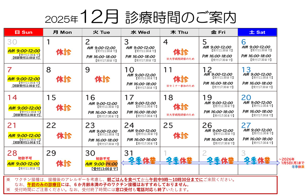 当院は基本的には予約制ではありませんが、診療内容によっては事前予約制となります。また、木曜日は初診の方の受付はしておりませんので、他の診療日をご検討ください。加えて、学会参加や大学病院研修、往診対応など、都合により診療時間や診療日を変更させていただく場合がございます。お手数ですが、ご足労いただく前に事前にお問い合わせ下さいますよう、よろしくお願い致します。
