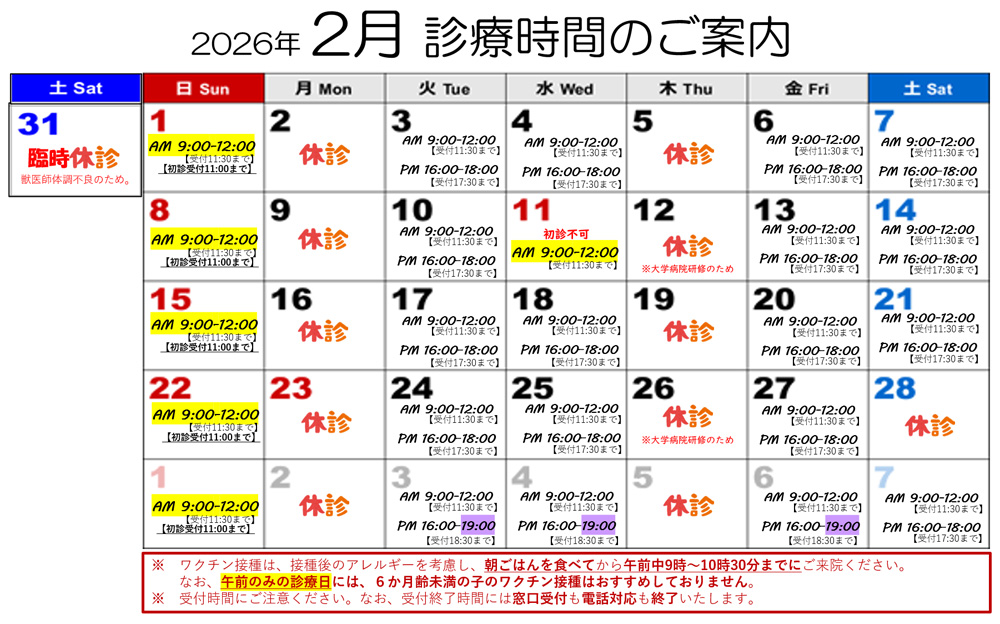 - 休診時は、診察・ホテル・シャンプーすべてお休みとなります。
